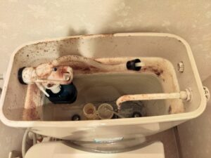 ご了承を頂いてタンクの蓋を外し、さらに詳しく点検すると、タンクの中に溜まった水を制御する弁が経年劣化によりボロボロになっていました。
