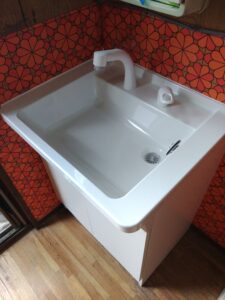 最後に止水栓も水側、お湯側ともに新品を取り付け、新しい洗面台を設置して工事完了です。