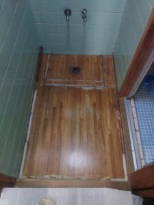 既存の洗面台を慎重に取外し、まずクッションフロアを張替えていきます。