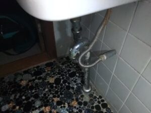 伺ってみると、蛇口から水漏れと、排水菅も老朽化して割れてしまっている状態で水が駄々洩れ状態でした。